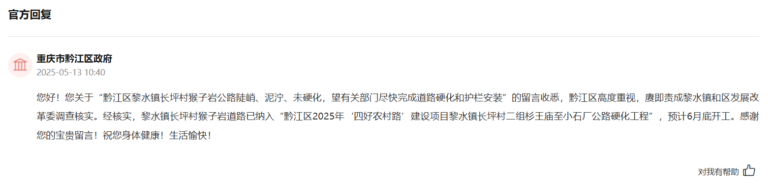 收到留言后,黔江区立即责成黎水镇和区发展改革委调查核实,很快就将长坪村猴子岩道路纳入“黔江区2025年‘四好农村路’建设项目黎水镇长坪村二组杉王庙至小石厂公路硬化工程”。