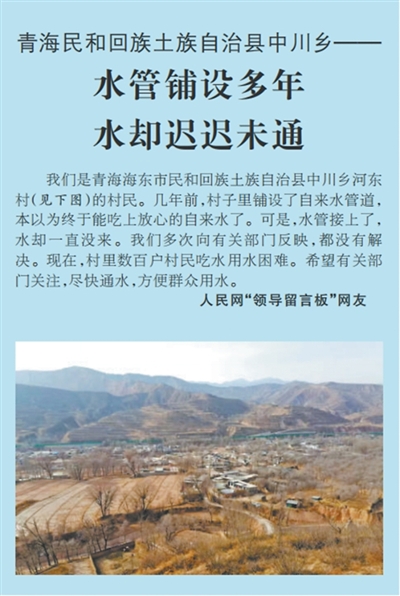 《人民日报》刊发来信反映“青海省民和回族土族自治县中川乡水管铺设多年,水却迟迟未通”的问题。